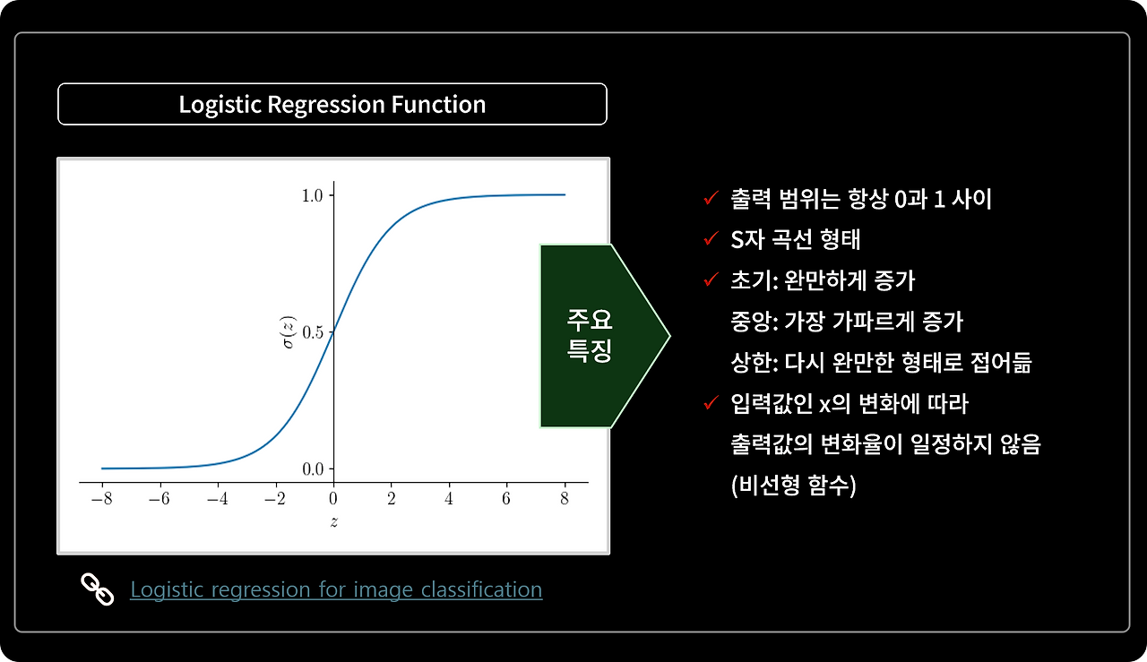 로지스틱 함수는 전통적으로 자원이 한정된 현실의 세계에서 어떠한 개체의 수가 어떻게 증가하는지(로지스틱 성장 모델)를 예측하는 데 활용되어 온 함수입니다. 이러한 로지스틱 함수는 다양한 분야에서 활용이 되는데, 그중 하나가 바로 로지스틱 회귀(Logistic Regression)입니다. 로지스틱 회귀는 0 또는 1과 같이 이진 분류(Binary Classification) 문제를 풀 때, 특정한 사건이 발생할 확률을 모델링하기 위해 사용됩니다.