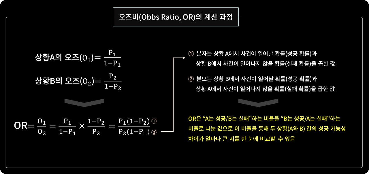 위의 OR에 대한 공식에서 분자(①)가 분모(②)보다 커서 OR이 1보다 큰 값이 나왔다면, 상황 A의 오즈가 상황 B의 오즈보다 더 높다는 것을 의미합니다. 반면, OR이 1보다 훨씬 작은 값이 나온다면, 상황 A에서 사건이 일어날 가능성이 훨씬 낮다는 것을 의미합니다.