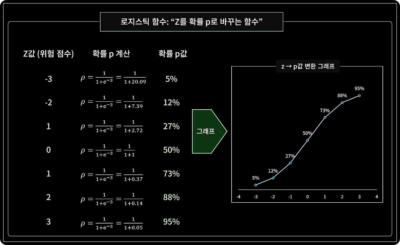 위험 점수인 z값을 3부터 -3까지의 범위로 각 z값에 대한 확률 p을 계산하면 아래와 같이 5%부터 95%까지 변환됩니다. 그리고 z값과 변환된 확률 p값의 관계를 그래프로 시각화하면 로지스틱 함수의 전형적 형태를 확인할 수 있습니다.