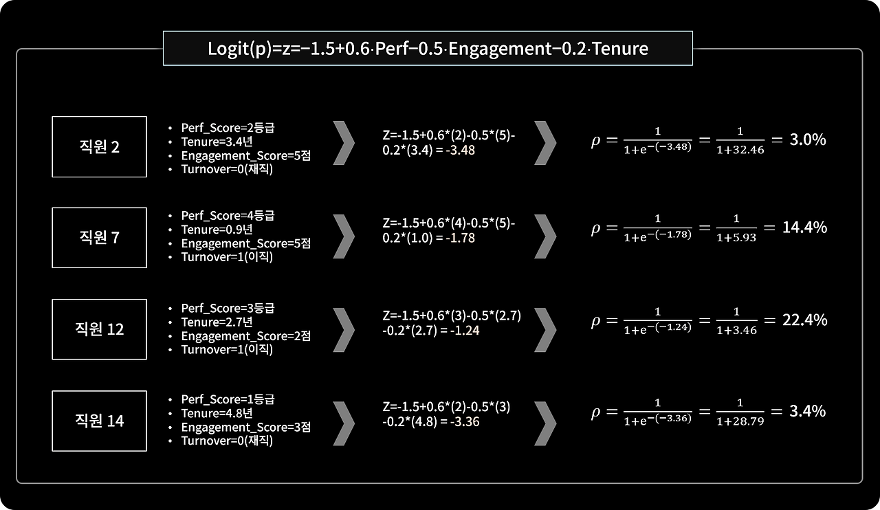앞서 본 로지스틱 회귀 방정식에 실제 데이터 샘플을 활용하여 이직 확률을 계산하겠습니다. 대표적으로 직원2, 직원 7, 직원 12, 직워 14의 데이터를 활용하겠습니다. 직원 2와 직원 14는 재직 중(Turnover=0)이고, 직원 7과 직원 12는 이직(Turnover=1)을 한 것으로 확인됩니다. 이직 위험 점수(z값)를 구한 후, 이직 확률 p값으로 변환하면 다음과 같습니다.