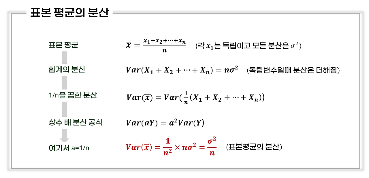 참고로 표본 평균의 분산이 σ²/n이기 때문에 표본 평균의 표준편차는 σ/√n입니다. 그런데 표본 평균의 분산을 보면, 시그마의 제곱을 표본의 크기인 n으로 나눈 값입니다. 이는 합계의 분산에 1/n을 곱한 형태입니다. 표본 평균의 분산을 계산하는 과정은 아래와 같습니다.