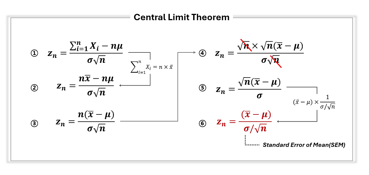 즉, 표본 평균들의 분포(Sampling distribution)의 표준편차가 SEM이며, 중심극한정리는 이 Sampling distribution의 분산이 σ²/n으로 가는 과정을 설명한 것입니다.