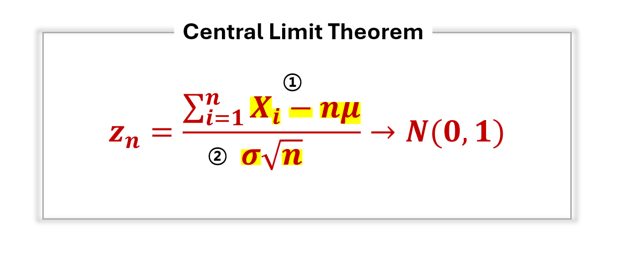 위 방정식의 ①은 개별 독립변수(원자료)의 합과 기대 합계의 차이를 뺀다는 뜻입니다. 개별 독립변수의 합인 ∑xi에 대하여 "기대되는 평균적인 합"은 nμ입니다. 예를 들어, 어떤 한 사람의 평균 점수가 μ=80점이라고 할 때, 10명의 합계를 추정함에 있어 10×80=800점이 가장 자연스러운 기대치입니다. 따라서 ①은 실제의 합계가 기대 합계보다 얼마나 크거나 작은지를 보려는 것입니다. 이를 통해 표본 평균의 중심을 0으로 옮기는 과정을 수행하게 됩니다.
