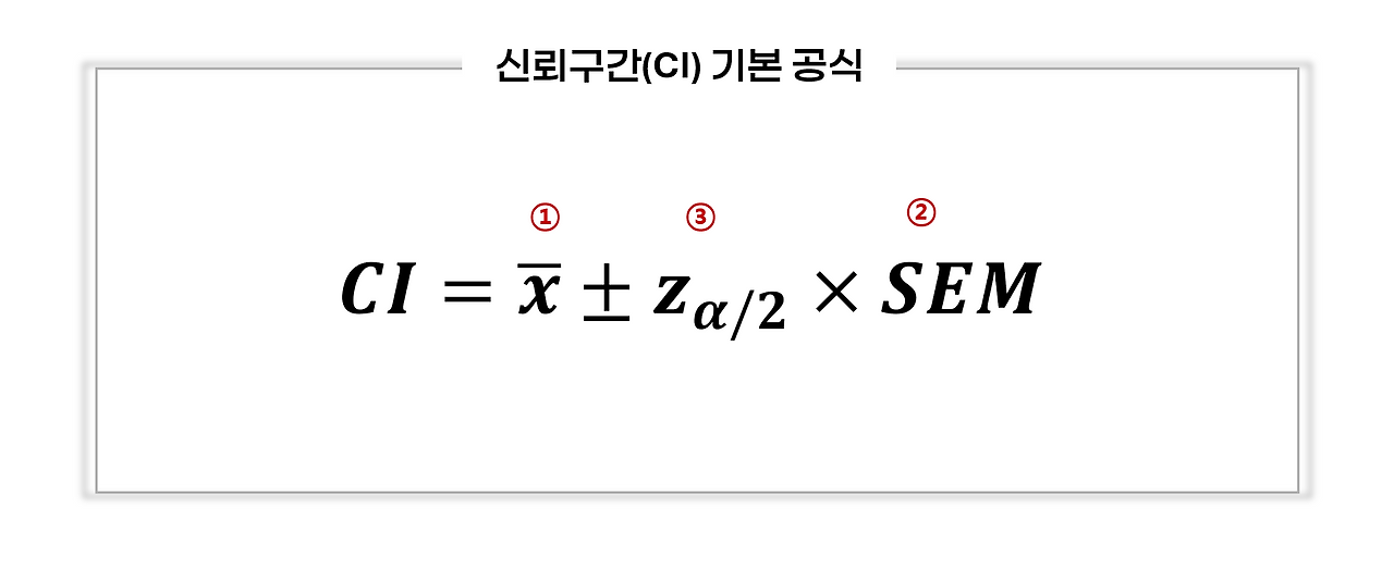 ①은 x-bar, 표본의 평균입니다. 그리고 ②는 SEM, 표본 평균의 표준오차입니다. ③은 [z_α/2]로 통계학에서는 "표준정규분포의 상단(오른쪽 꼬리 부분)의 면적이 정확히 α/2가 되게 만드는 z값(임계값)을 의미합니다. 여기서 z값은 평균이 0이고, 표준편차가 1인 표준정규분포의 가로축 값입니다. α(알파)는 전체 오차 범위를 말합니다. 보통 5%(0.05) 또는 1%(0.01)를 많이 쓰는 편입니다. 그리고 α/2는 오차를 양쪽 끝(꼬리)으로 똑같이 나누었을 때 한쪽 끝의 면적을 뜻합니다. 이렇게 양쪽의 임계값(경계값)을 활용하는 검정 방식을 양측 검정(Two-tailed test)이라고 합니다.