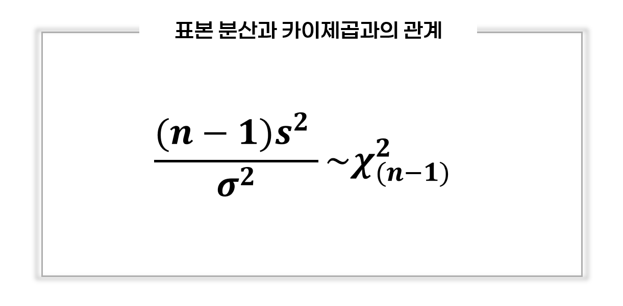통계학자들은 우리가 계산한 표본의 분산(s의 제곱)이 수학적으로 카이제곱분포와 아주 밀접한 관계가 있다는 것을 알아냈습니다. 구체적으로 아래와 같은 관계가 성립합니다. 이를 말로 요약하면 "우리가 추출한 표본들이 얼마나 변동성이 있는지 측정(표본 분산)하면, 일정한 규칙(카이제곱분포)을 따르게 된다."라는 뜻입니다.
