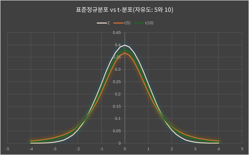 왜 이런 차이가 생길까요? 표본의 크기가 적을 때는 모집단의 표준편차를 정확히 알기 어렵습니다. 뿐만 아니라 현실의 Data Set은 모수에 대한 특성을 파악하는 데 한계가 있습니다. 그래서 평균을 비교할 때 정규분포보다 더 신중한 분포가 필요한데, 그때 등장하는 것이 t-분포입니다. 정규분포가 이미 잘 정리된 세계를 보여주는 것이라면, t-분포는 아직 정보가 충분하지 않아서 조금 더 조심해야 하는 세계라고 할 수 있습니다.