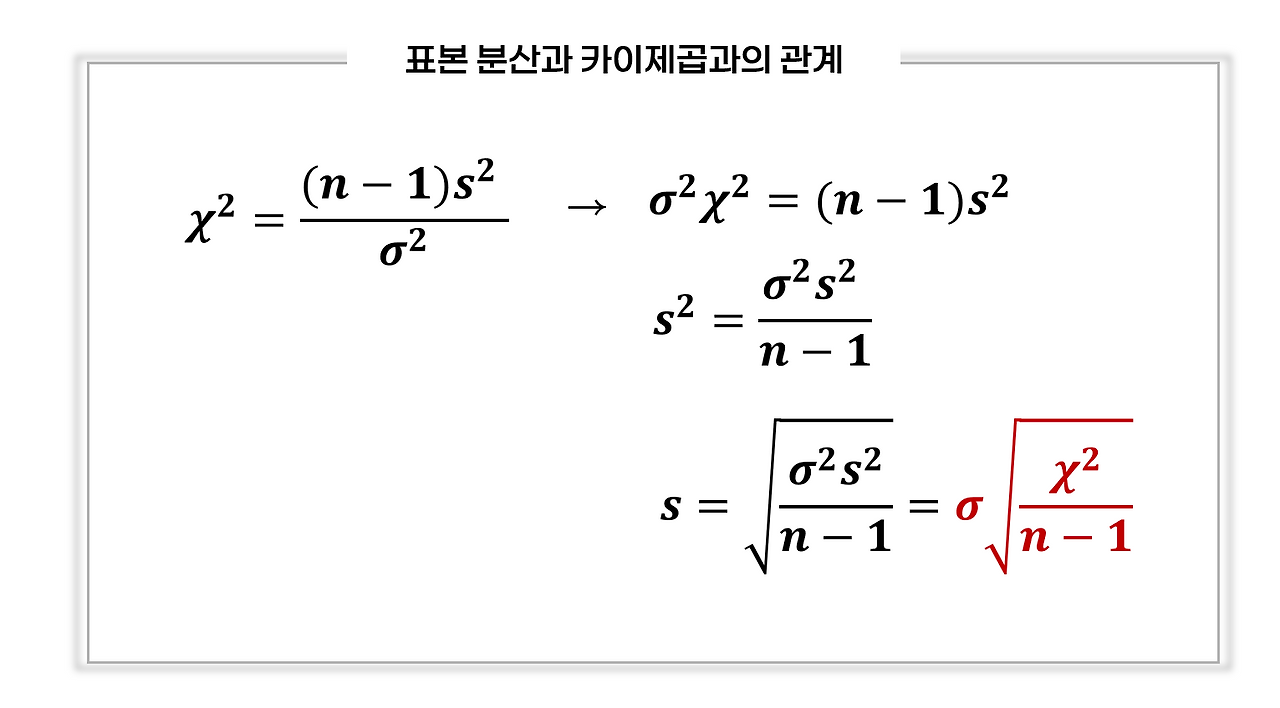 표본 분산과 카이제곱과의 관계를 나타내는 식을 표본의 표준편차(s)에 대해 정리하면, s라는 값에는 우리가 모르는 모집단의 표준편차(σ)와 카이제곱분포가 동시에 포함되어 있다는 것을 알 수 있습니다.