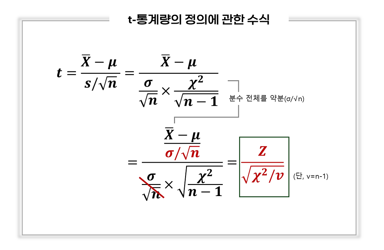 위와 같이 계산된 표본의 표준편차를 가지고 t-통계량을 계산하는 수식에 대입하면, t-통계량은 ① 평균 차이의 표준화 공식(z), ② 카이제곱, ③ 표본의 크기(자유도=n-1)만 남게 되는 것을 알 수 있습니다. 이를 통해 t-통계량은 [평균에 대한 표준적인 차이]를 [표본의 변동성]으로 나눈 값임을 알 수 있으며, [표본의 변동성]은 카이제곱의 성질을 가지고 있다는 것을 확인할 수 있습니다.