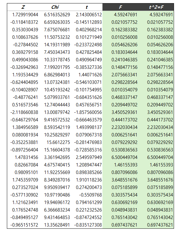 마지막으로 가상의 Data를 통해 표준정규분포, 카이제곱분포, t분포, F분포의 관계를 확인하겠습니다. Z열은 우리가 표집 과정을 거쳐 계산한 평균과 실제 모집단의 평균 차이가 얼마인지를 발견한 값들, Chi열은 실제 모집단이 갖고 있는 순수한 변동성(제곱)의 크기를 모아 놓은 값들, t열은 Z값과 카이제곱의 제곱근의 비율 값들(자유도 10 가정), F열은 Z값과 Chi값의 비율(자유도 10) 값들의 모음입니다. 녹색 음영으로 표시된 바와 같이 t의 제곱이 F값과 같음을 알 수 있습니다.