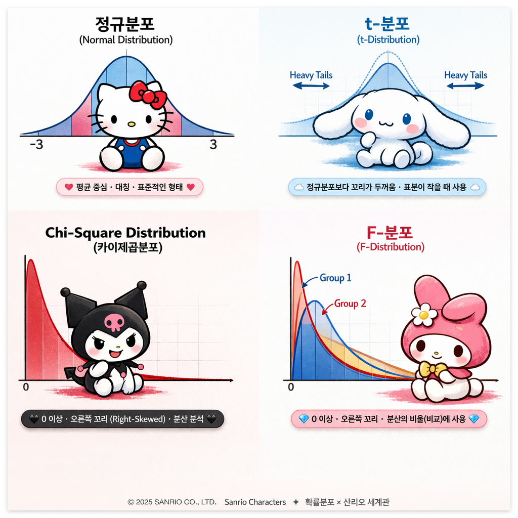 만 5세 6개월이 된 저의 딸이 좋아하는 산리오 친구들과 오늘 소개하고자 하는 확률분포의 특징을 매칭해봤습니다. 아래와 같이 헬로키티와 정규분포, 시나몬롤과 t-분포, 쿠로미와 카이제곱분포, 마이멜로디와 F-분포로 짝을 지었습니다.