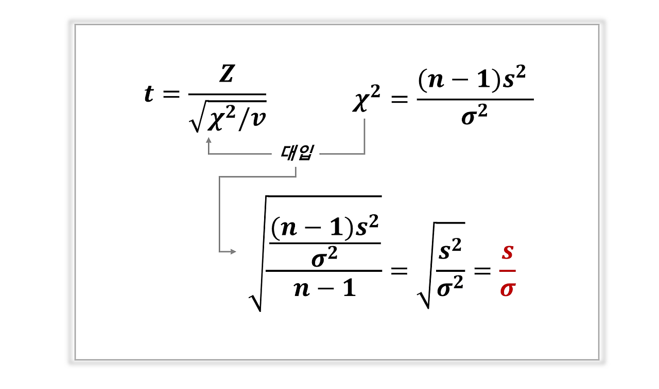 우리가 원래 사용하는 표준정규분포(Z)는 모분산을 알고 있다는 전제에서 만들어진 이상적인 분포입니다. 하지만 현실의 한계로 전체 집단의 분산을 알 길이 없는 상황에서는 어쩔 수 없이 표본의 분산을 사용해야 하는데 이때 발생하는 불확실성을 해결하기 위해 카이제곱을 빌려온 것이 이 공식의 핵심이라 하겠습니다.