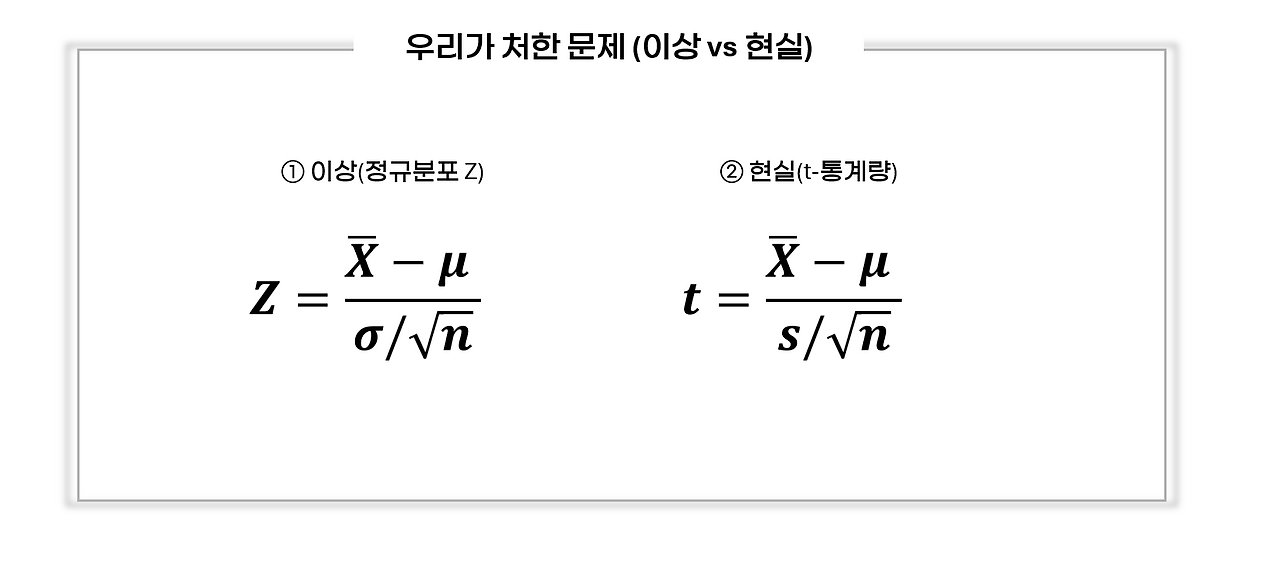 우리가 평균을 비교할 때 가장 먼저 떠올리는 표준화 공식(Z)은 아래와 같습니다. 그런데 문제는 모집단의 표준편차(σ) 입니다. 이건 현실적으로 정확한 값을 알기 어렵습니다. 그래서 우리는 모집단의 표준편차 대신 표본의 표준편차(s)를 사용해야 합니다. 이상을 메우기 위한 현실적인 방법을 채택하게 되면서, 우리는 "t-통계량이라는 것의 근본적인 수학적 의미가 무엇인지"를 파헤치게 됩니다.