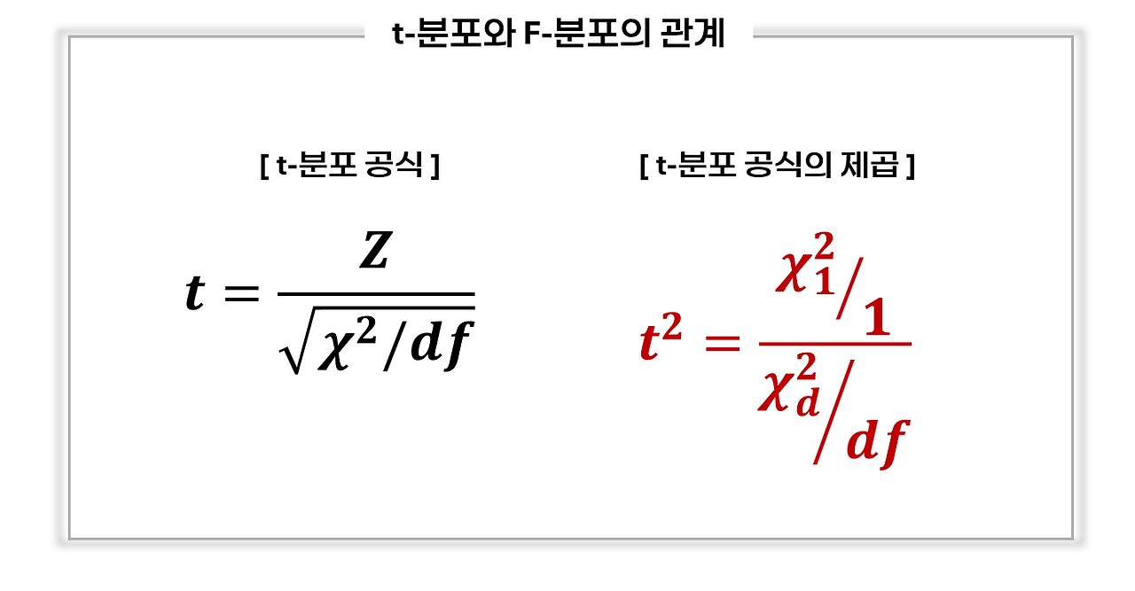 앞서 소개한 t-분포에 관한 공식(t-통계량을 계산하는 공식)을 통째로 제곱하면 F-분포와 연결됩니다. 아래와 같이 t-분포에 대한 공식을 제곱하면 자유도가 (1, df)인 F-분포가 됩니다. 그래서 "두 집단의 평균이 다른가?"와 같은 t-검정과 "여러 집단의 평균이 다른가?"와 같은 F-검정(ANOVA)는 수학적으로 같은 뿌리를 두고 있다고 말하고 있습니다.