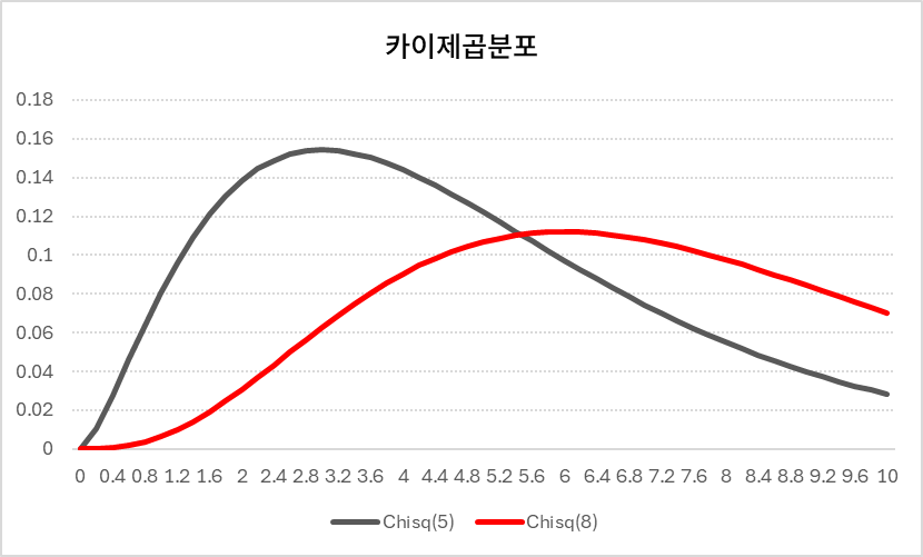 그래서 카이제곱의 값은 0보다 작을 수 없습니다. 제곱을 해서 모두 더했기 때문입니다. 이에 그래프는 0부터 시작해서 오른쪽으로 길게 뻗은 모양입니다. 또한 자유도가 커지면(데이터가 많아질수록) 오차의 합도 커지기 때문에 그래프의 봉우리가 점점 오른쪽으로 이동하며 완만해집니다. 아래는 0부터 5까지의 +0.1 단위의 확률변수에 대한 카이제곱분포를 자유도 5와 자유도 8인 경우를 비교하여 생성한 그래프입니다.