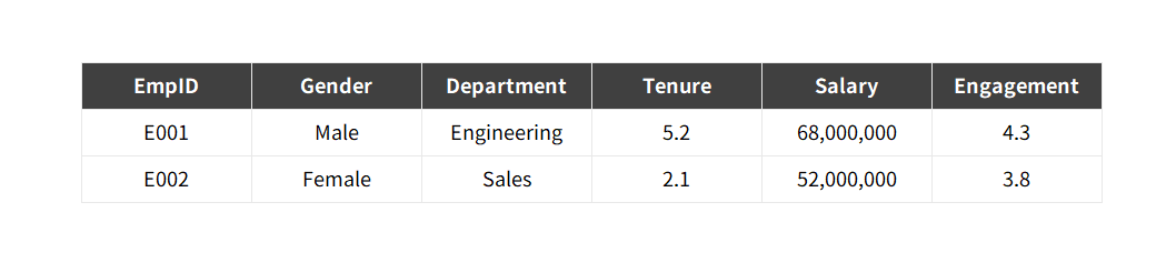 데이터는 관찰된 값들의 집합이고, 변수는 그 값을 구성하는 속성(Attribute) 또는 측정 항목입니다. 아래와 같이 HR 부서의 직원 데이터가 있다고 가정해 봅시다.