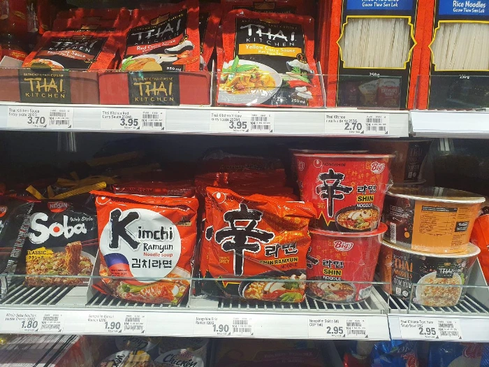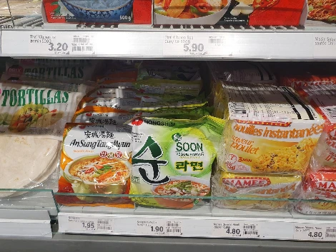 대형마트에서 볼 수 있는 한국 라면, 스위스인의 입맛을 사로잡을 K-빨간 맛과 채식주의자를 위한 비건 라면