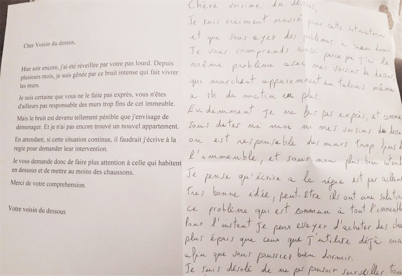 3월 봉쇄령 이후 몇 달 동안은 정말 미치고 팔짝 뛸 노릇이었다. 재택근무를 시작했고, 이웃 역시 마찬가지였다. 얇은 바닥을 사이에 두고 24시간을 함께 하는 기분이었다. 온종일 집에 있어도 대체로 침대나 소파에 널브러져 있는 나로서는 왜 짧은 보폭으로 우다다다 뛰어다니는지 이해할 수 없었다. 인내심이 극에 달했다. 또다시 올라가려다 이젠 서로가 얼굴을 마주하기에 민망한 상황이니 편지를 쓰기로 했다.