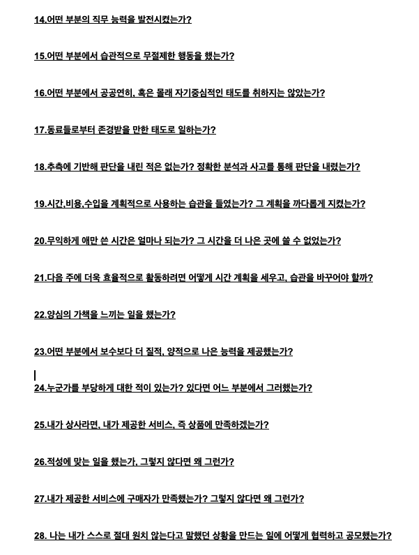 "목표는 발전되어야 한다." 능력을 효율적으로 팔려면, 다소 속도가 느리다고 해도 꾸준히 앞으로 나아가야 한다. 스스로에게 이 질문들을 던져보아라. 질문들은 자기 분석에 도움이 되는 것들이다. 이것은 연말에 시행하는 게 좋다. 이에 맞춰 새해 발전 계획을 능률적으로 세울 수 있다. 나는 한 주를 점검하는 툴을 만들고 싶었다. 소요된 업무 시간 중 'TOP 5개 순위의 가장 오래 걸린 업무'들을 점검하고 개선하려 했지만, 효율적이지 못했다. 그런데, 이 질문들을 보고 깨달았다. 제대로 된 분석은 업무를 포함하여 내가 한 주를 어떻게 보냈는지를 아는 게 중요했다. 나는 이 질문들을 보자마자 '한 주 점검표'로 활용해야겠다고 생각했다. 훌륭한 점검표를 만들어준 힐에게 감사했다.