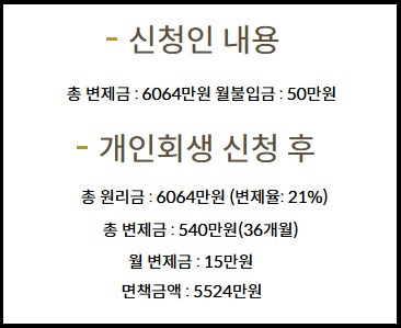 이후에는 개인회생 절차를 밟아 가며 월 15만원의 변제금으로 사건을 결정 받을 수 있게되었습니다.