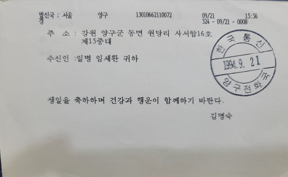 형의 바램처럼 친구들은 자주 소식을 전해주었습니다. 생일이면 <축전>도 보내주었고요. 지금 돌이켜보니 저의 군 생활은 행복했었습니다.