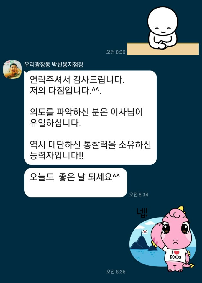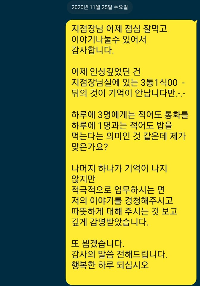 "지역본부장님 식사가 있긴 한데요. 그래도 약속이 잡혀있더라도 저는 고객님이 우선이에요. 우리은행 본부장님보다도, 우리은행 행장님보다도 더 높은 분이 바로 고객님이거든요. 들으시면 섭섭하시겠지만 저는 제일 높은 분이 고객님이라고 생각해요. 제가 가든파이브지점 있을 떄 가온감정평가법인 재무이사로 계시면서 엄청 많이 도와주셨잖아요. 우리 본부장님도 이해하실겁니다. 하하"