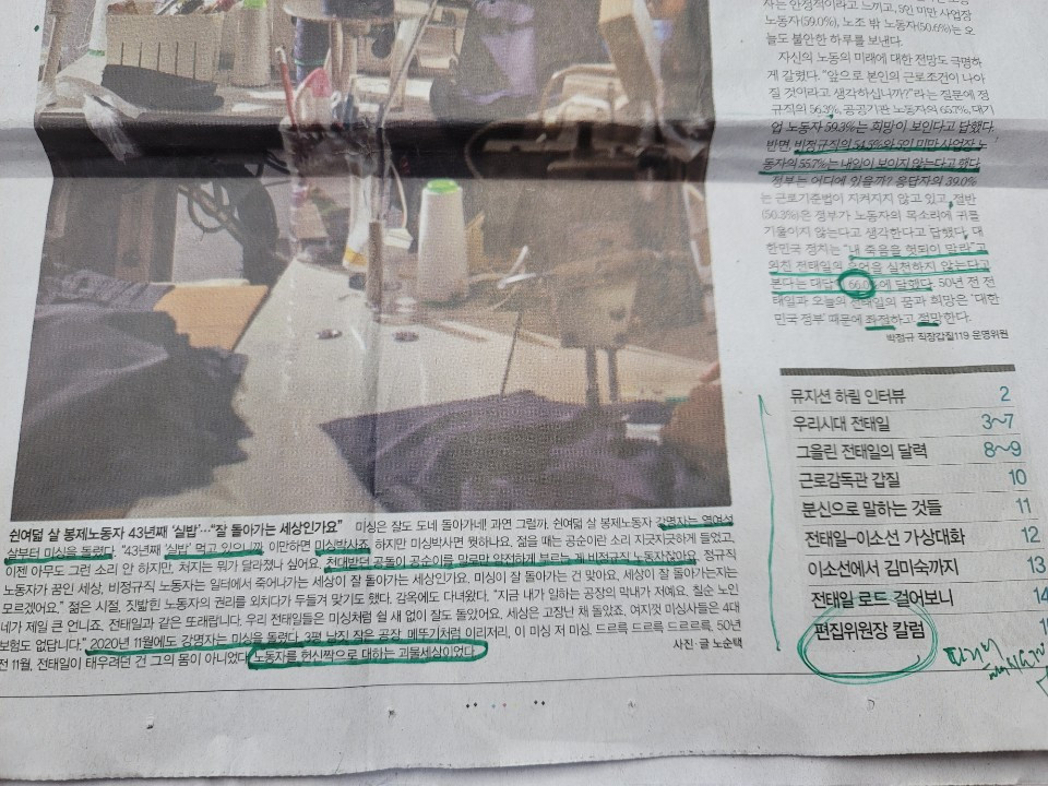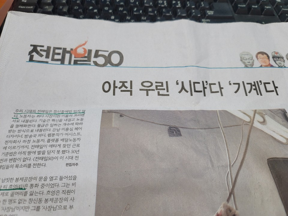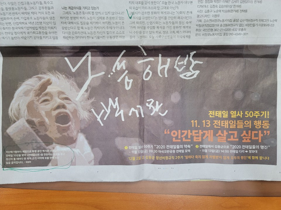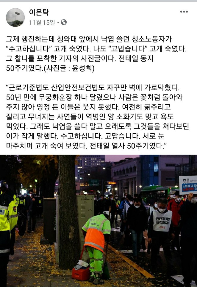 전태일의 풀빵이 상징하는 연대정신은 노동과 진보의 중요한 덕목이다. 계급의식이 없다면 감정이입을 통한 연대정신이라도 기대해야 하는데 그조차 상층에로의 일방으로만 이뤄진다. "우리가 김용균이다"와 "우리가 조국이다"를 비교해보라.