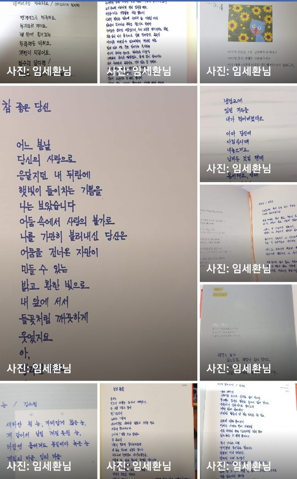 그 이후에는 소설을 옮겨적고, 한국단편수필을 옮겨적고 그리고 김용택시인의 <어쩌면별들이너의 슬픔을 가져갈지도 몰라>라는 필사시책을 하루에 하나씩 적어보았습니다. 그 기록은 온전히 페이스북에 옮겨놓았습니다. 하루에 하나의 시를 잇고 생각을 깊게 해 보는 것 너무나도 소중한 경험이었습니다.