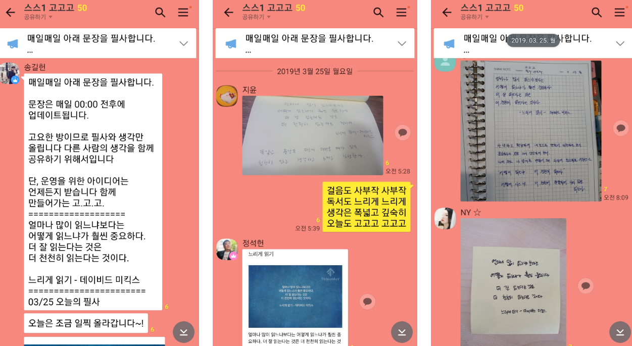 <고요하지만 고귀한 생각고찰, 문장나눔 생각잇기 필사방(패스워드 gogogo, 이하 <고고고>)>입니다. 현재 50명의 친구들과 함께 필사를 하고 생각을 나누고 있습니다.