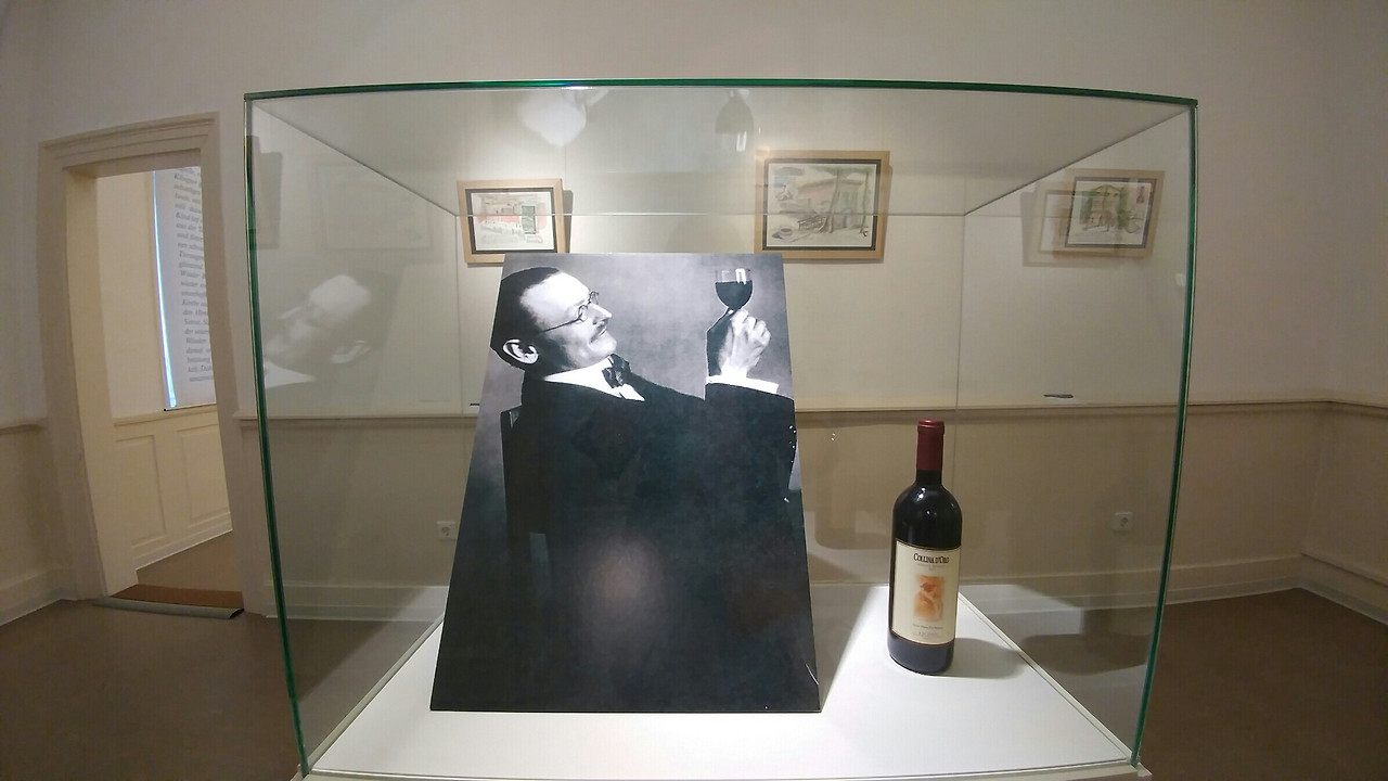 독일 칼프에 있는 헤세 박물관 내의 헤세 사진과 와인