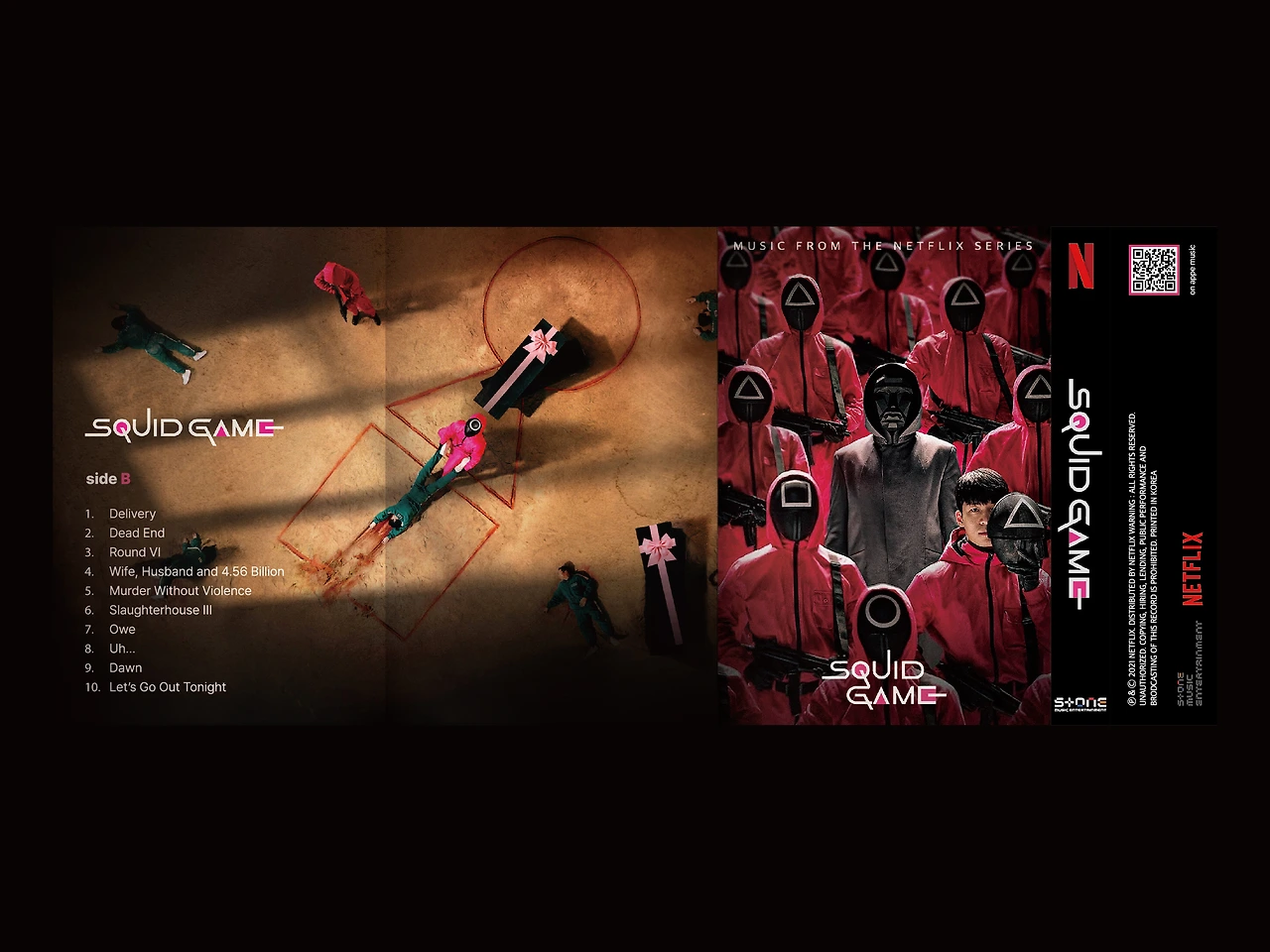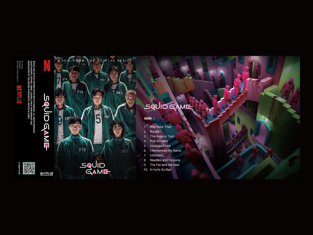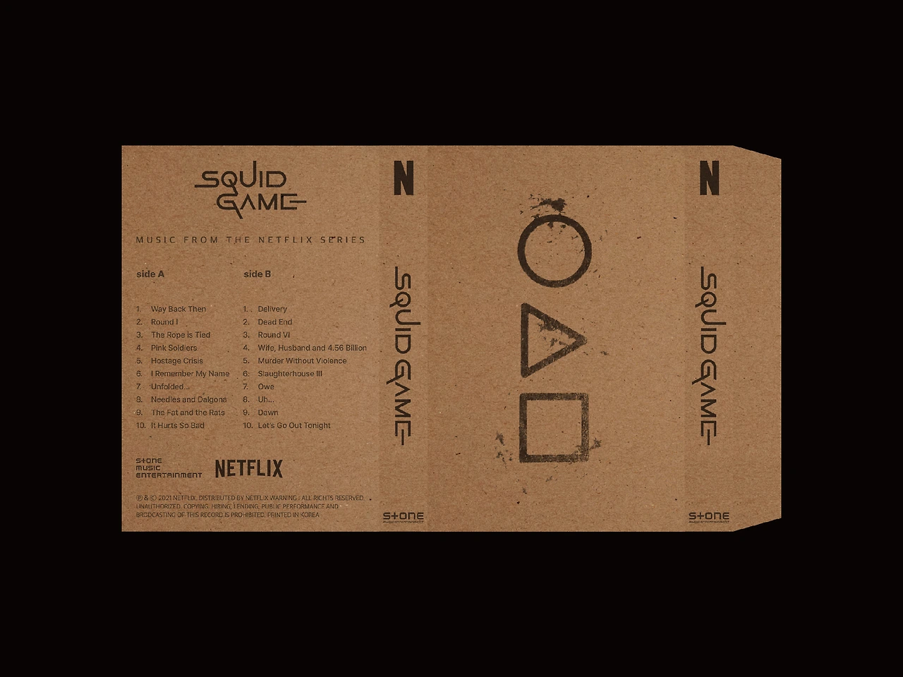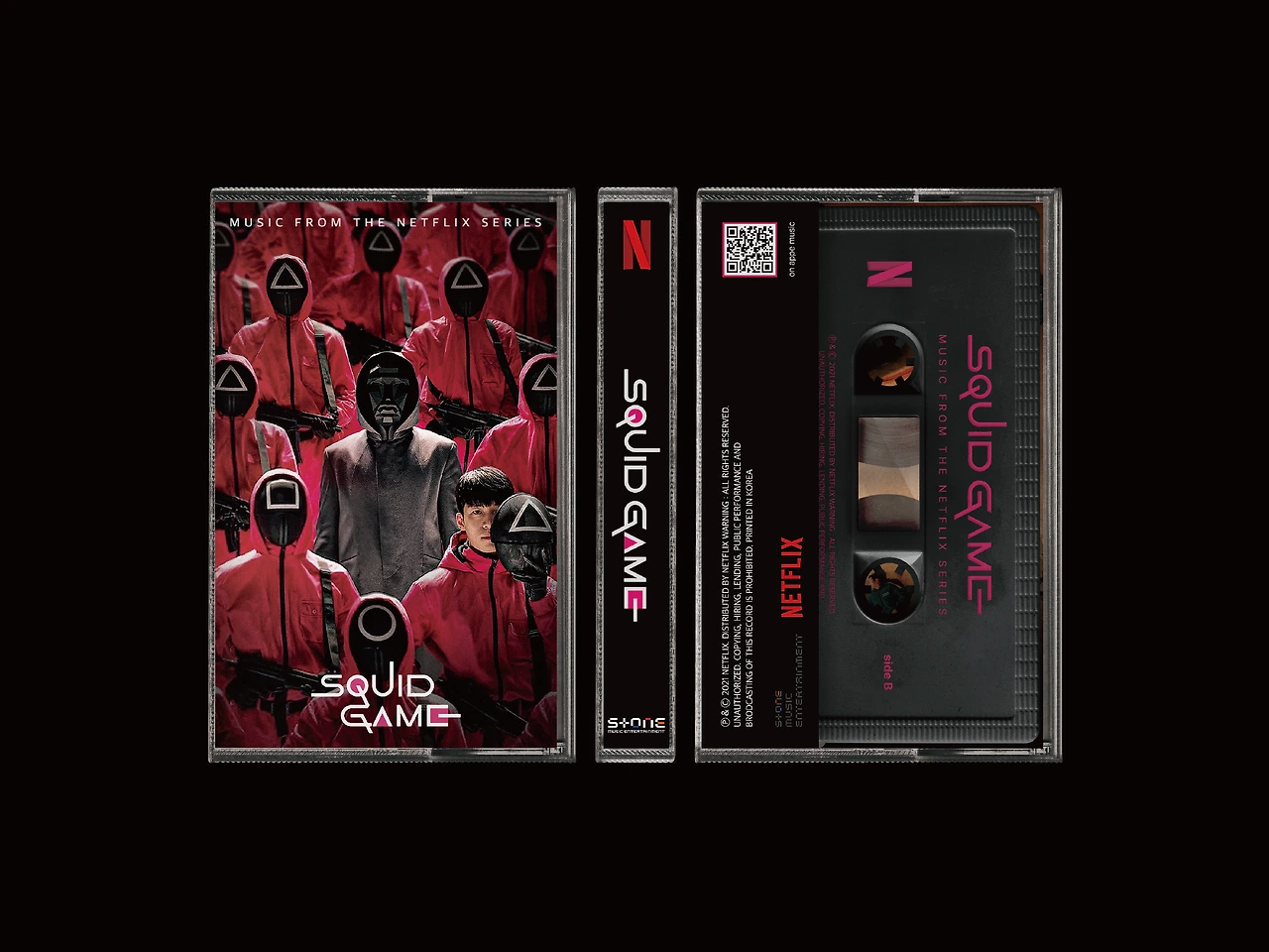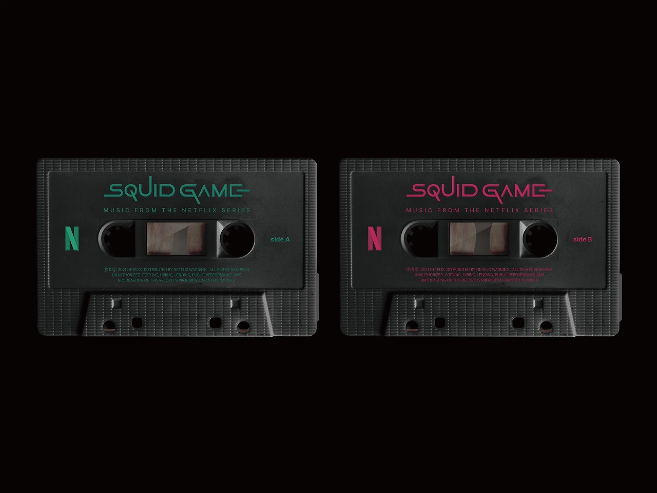 테이프는 블랙바탕에 Side A는 참가자의 유니폼 컬러인 초록색, Side B는 진행자의 유니폼 컬러인 핑크색 타이포그래피를 적용하여 [오징어게임]의 시각적 아이덴티티를 살렸습니다.