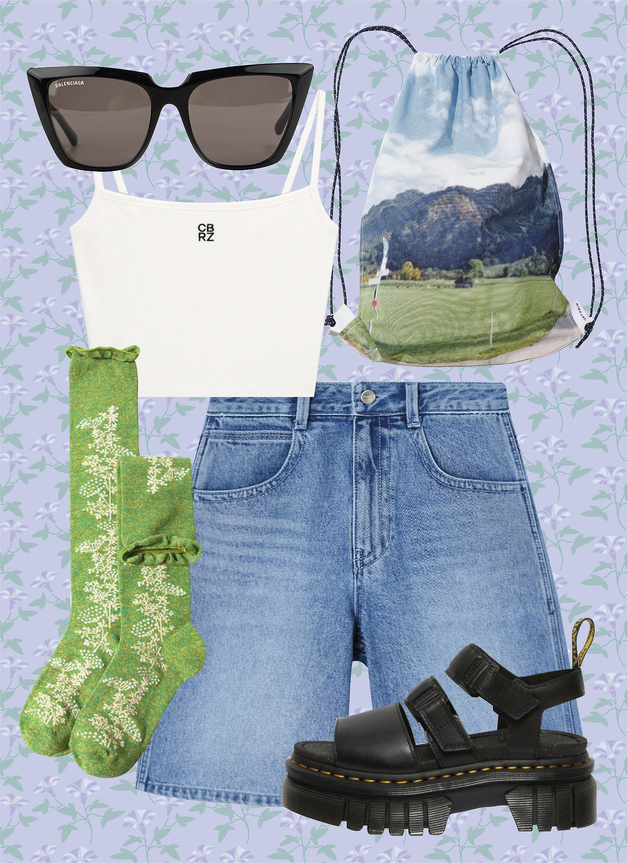 바지의 블루 컬러와 니삭스의 그린 컬러의 색상이 비교적 명도가 높아 상의의 화이트와 어우러지면 무게감 없이 너무 가벼운 느낌을 주기 때문에 블랙 샌들과 블랙 선글라스를 매치해 주었다. 이렇게 블랙 아이템들로 마무리하여 전반적인 코드에 시크함을 가미해 주었다.