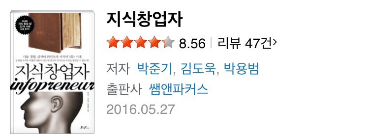 내 꿈중 하나는 내가 쓰는 글을 묶어서 하나의 책으로 내는 것이다. 이것을 이뤄내기 위해 책을 읽고, 인상깊은 구절을 필사하고, 그날의 느낌을 일기로 적고 있지만 이것 말고도 다른 방법이 없을까 하던 차에 "지식창업자"라는 책을 발견하게 되었다.