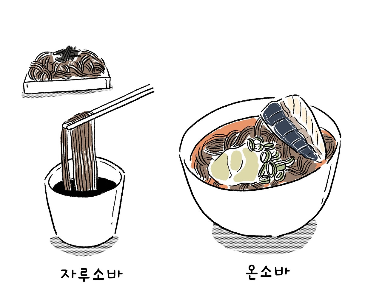 그런데 쯔유부터는 정말 너무 다양해서 뭐라 말하기가 힘들다. 우리나라에선 주로 쯔유에 면을 찍어먹는 냉소바, 자루소바가 대중적인데, 일본에선 따뜻한 국물에 면을 담가 먹는 온소바를 더 많이 먹는 것 같다. 여기에 생선을 넣는다든지 이것저것 다양한 재료를 넣어 만들기도 하는데, 개인적인 취향은 그냥 차가운 자루소바가 제일 나은 것 같다. 우리나라에서 왜 온소바가 인기가 없을까 생각해 봤는데, 공통적으로 일본의 온소바 국물이 우리 입맛에 좀 비린 느낌이 있어서인 듯 하다. 차가운 쯔유에서는 가쓰오부시를 비롯한 몇 가지 재료들의 비린맛이 안느껴지는데, 우선 염도가 높아서인 것도 같고, 비린 맛 자체가 따뜻한 국물에 우러나오는 특성이 있어서인 것도 영향이 있지 않나 싶다. 또 하나는 그냥 우리나라 사람들 자체가 족발에 같이 먹는 비빔 메밀면이라든가 들기름 메밀면 등 메밀면을 차갑게 먹는 것에 익숙해진 측면도 있는 것 같고. 다만 메밀이 찬 성분이 있어서 원래 온소바로 먹는 것이 몸에는 더 좋지 않나 싶기도 하다.