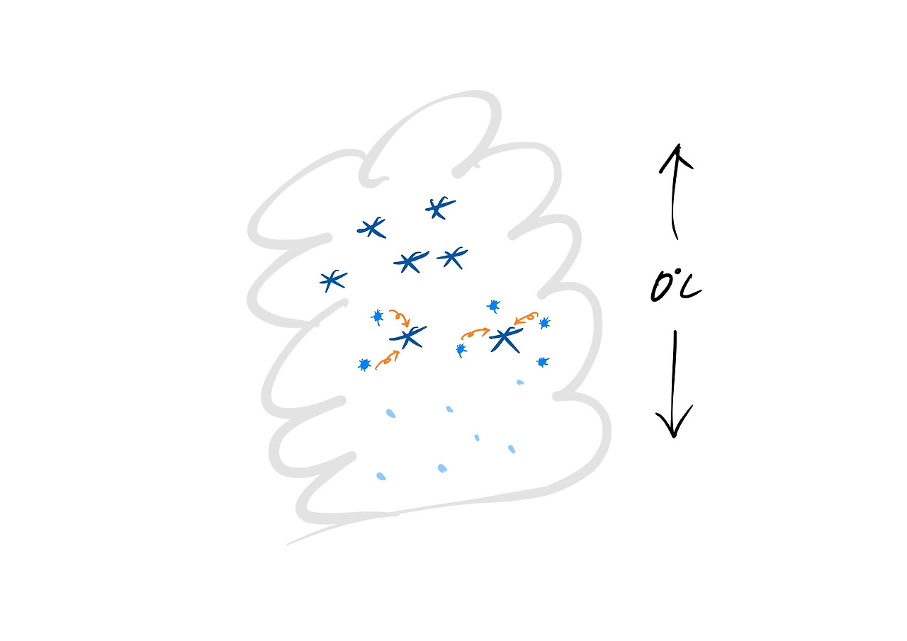 이 물방울들이 함께 공존하고 있는 얼음입자에 달라붙어 얼음입자를 크게 크게 만들고, 그 얼음입자가 더 이상 중력을 거스를 수 없을 때 땅으로 떨어지게 된다.