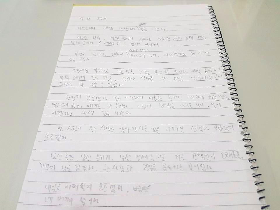캠프의 일정이 오늘로서 모두 마무리됐다. 어제처럼 아침 일찍 나서 산책을 하려 했으나 그러지 못했다. 굳이 이유를 말해야 하나 싶긴 하지만, 대놓고 불성실한 사람이라 낙인찍히는 건 또 싫으니, 변명이라도 해보자. 2박 3일 일정의 결과물로 조별 과제 발표와 평가가 남았고, 우리 조 발표자는 어쩌다 보니 바로 나였다. 새벽부터 일어나 발표 준비를 했기에 산책을 미룰 수밖에 없었다(결국 모든 조를 통틀어서 1등을 해, 상품으로 카카오 스피커를 받았다. 발표자의 역량은 대단히 부족했지만, 조원들의 노고가 응집된 콘텐츠가 훌륭했다는 겸손은 꼭 떨어야겠다).