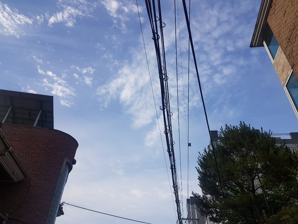 AM 7:20. 오늘은 동네 골목길을 산책했다. 어디서나 볼법한 굽이굽이 좁은 길과 낮은 연립 주택, 그리고 다닥다닥 붙어 있는 빌라. 그 흔해 빠진 모습과 정돈되지 않은 담담한 생활의 풍경이 좋다. 누군가에게는 치열한 삶의 현장이, 내게는 한가로이 거니는 산책길이 되었다는 생각에 마음이 묘했다. 특히나 하늘에 사선으로 걸린 전깃줄을 보니 더 그렇다.