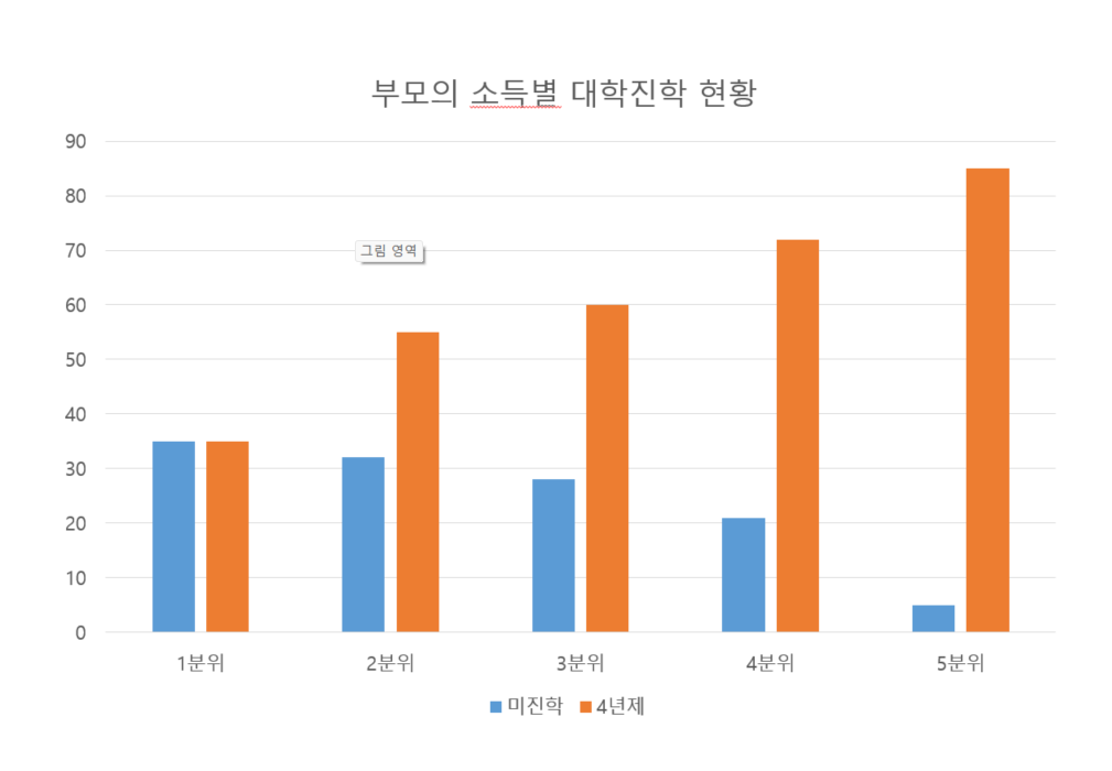 저는 이 사실을 인정하기는 싫습니다. 우리 대부분은 집이 가난해도 본인이 열심히 공부하면 얼마든지 상류층으로 올라갈 수 있다는 희망을 가지고 있기 때문입니다. 하지만 현실은 그렇지가 않습니다. 그동안 여러 전문기관에서 실시한 통계자료에 따르면, 부모의 경제력이 공무원 합격을 결정한다는 것은 엄연한 사실입니다. 아래의 표는 부모의 소득에 따른 자녀의 대학진학 현황을 보여주고 있습니다. 표에서처럼 소득이 높은 집안의 자녀들이 낮은 집안의 자녀들보다 월등하게 좋은 대학에 진학하고 있습니다.