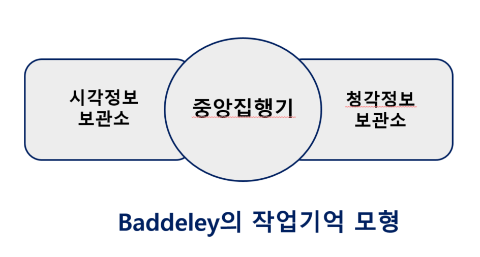 아래의 그림은 인간의 작업기억에 관한 유명한 모형인 <Baddeley의 작업기억 모형>입니다. 작업기억은 단기기억의 일종으로 두뇌의 메모장과도 같습니다. 예를 들어 여러분이 전화번호를 기억하려고 할 때 작동하는 기억이 바로 작업기억입니다. 그림처럼 작업기억은 시각정보를 저장하는 곳과 청각정보를 저장하는 곳이 나눠져 있습니다. 그리고 중앙집행기라는 부위가 이 2개의 정보저장소를 관리합니다.