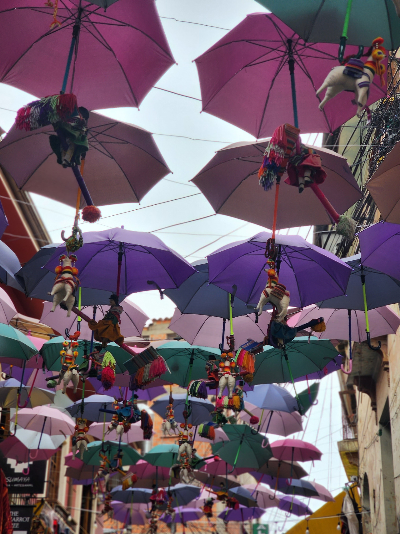 시장 골목의 하늘에는 보라색의 우산들이 대롱대롱 매달려 있다. 고개를 꺽어 올려다 보았다. 우산손잡이에 동화 속처럼 빗자루를 탄 마녀인형들이 바람에 흔들린다. 이런 소품들이 신비롭고 묘한 분위기를 만들고 있었다.