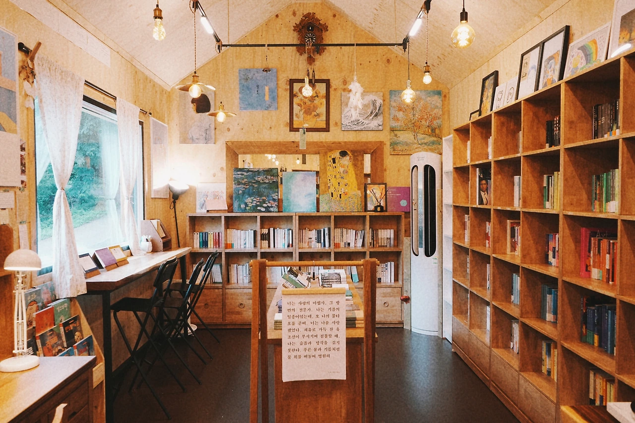 이슬비가 내렸다. 안개가 자욱한 산길을 굽이굽이 들어갔다. 여기가 맞아?라고 두세 번쯤 옹알거렸을 때 오른쪽으로 서점이 보였다. 주변의 색감이 따뜻하다. 숨을 들이마시면 초록초록한 산공기가 느껴졌다. 깊은 숲 속 오두막집을 발견한 느낌이 이런 거려나.