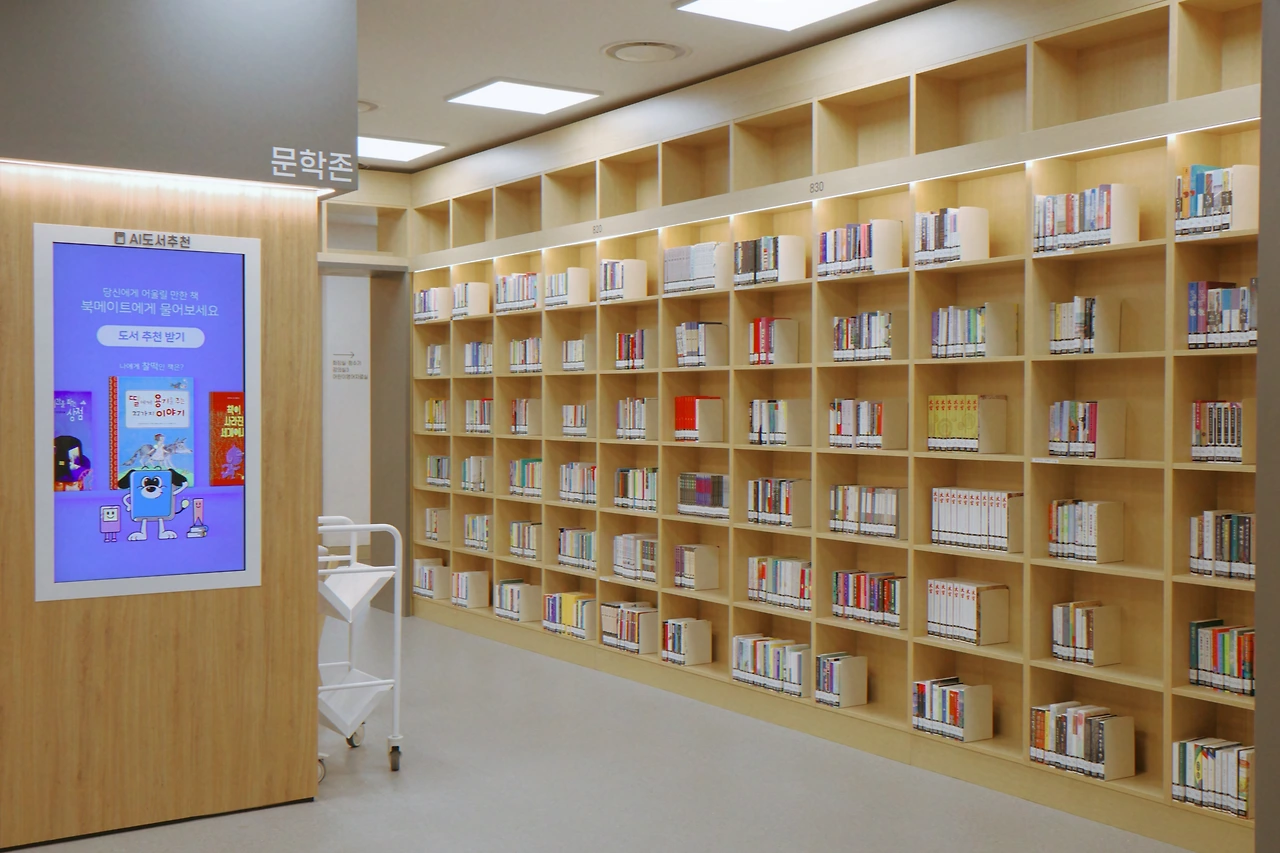 강동숲속도서관은 2025년 5월 14일에 개관했다. 개관한 지 1년도 채 되지 않아 외관이 깔끔하고 시설도 깨끗하다. 진열된 책 역시 낡은 느낌이 없다. 위치로는 명일근린공원 내에 있다고 해도 좋을 정도라, 이름도 그래서 숲속도서관이다. '자연 속의 도서관'을 지향하는 취지에 걸맞게 사방이 푸릇하다.