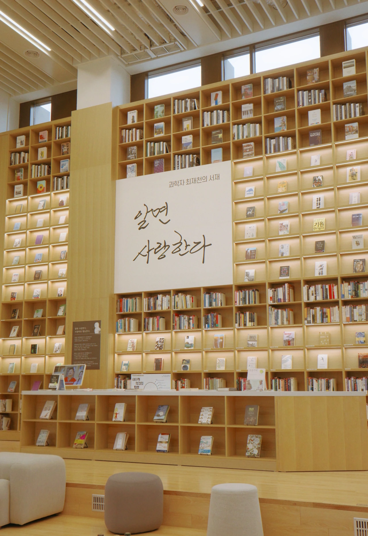 나는 1층 입구로 들어가 계단을 타고 곧장 2층으로 향한다. 그러면 가장 좋아하는 공간이 나온다. 탁 트인 공간 속 넓고 큰 과학자의 서재 구역이다. 한쪽으로 난 커다란 유리창을 통해 나무를 보고 흙을 느낀다. 사방으로 문학의 공기가 흐르는 이곳은 사실 과학 특화 도서관이라고 한다. 그래서 시그니처라고 할 수 있는 서가도 '과학자 최재천 교수님의 서재'다.