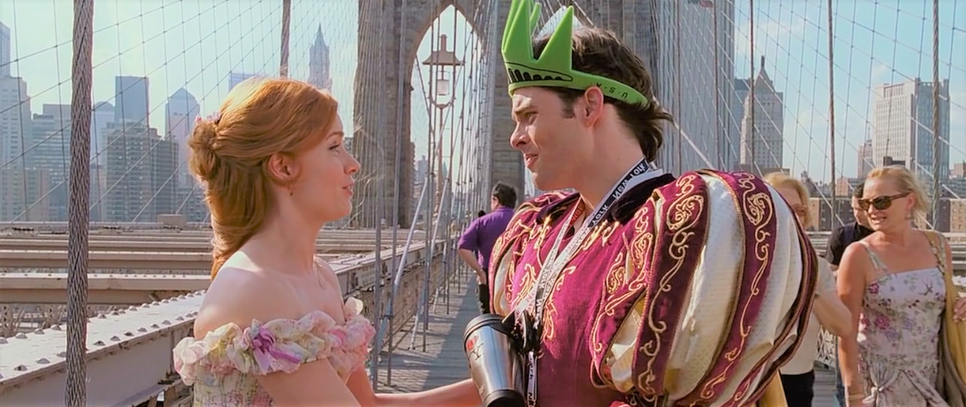 지젤은 그녀를 찾아 뉴욕까지 쫓아온 에드워드 왕자(제임스 마스던)와 처음으로 데이트를 하기로 한다. 동화 속에는 행복이 전부이니 지젤에게 데이트란 무용한 것이고 사랑은 그저 첫눈에 반해 다음날 결혼에 이를 수도 있는 이상적인 것이다. 그러나 이미 뉴욕에서 지내며 이성적인 로버트(패트릭 뎀시)로부터 인간의 사랑을 알게 된 지젤은 에드워드가 자신에게 맞는 남자인지 알아보기 위해 데이트를 신청하게 된다. 그렇게 첫 데이트로 두 사람은 브루클린 브리지를 걷게 되고 그야말로 웃지 못 할 어색의 끝을 보여준다.