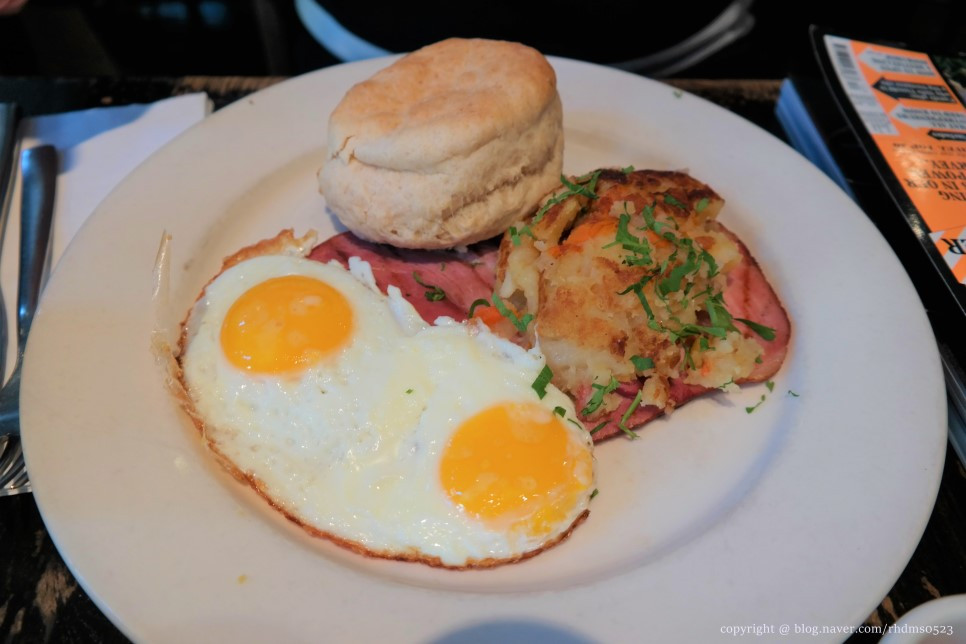 컨트리 블랙패스트. 13달러. 계란과 감자, 햄, 빵처럼 기본적인 음식으로 구성된 세트다 보니 건강해지는 느낌이었다고 해야 하나. 고소하고 맛깔나는 맛. / 팁은 전체 가격의 20% 정도로 계산해서 덧붙였다.