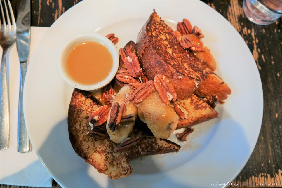 브리오슈 프렌치토스트 13달러. 바삭한 토스트에 메이플 버터 맛과 캬라멜 소스를 얹은 바나나, 호두 덕분에 달달하면서도 포만감이 느껴지는 맛이었다.