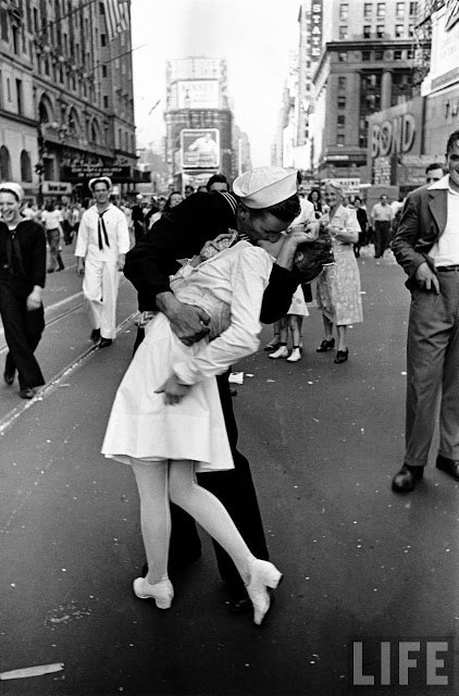 오른쪽: 1945년 8월 14일. 일본이 패배를 인정한 직후 한 해군이 보여준 기쁨의 키스 세레모니. 그 순간을 담은 사진은 타임스퀘어를 기념하는 가장 유명한 사진 중 하나가 되었다. http://www.vintag.es/