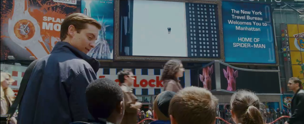 피터 파커가 국민적 영웅이 되어버린 스파이더맨 광고를 직접 보고 있는 장면이다.