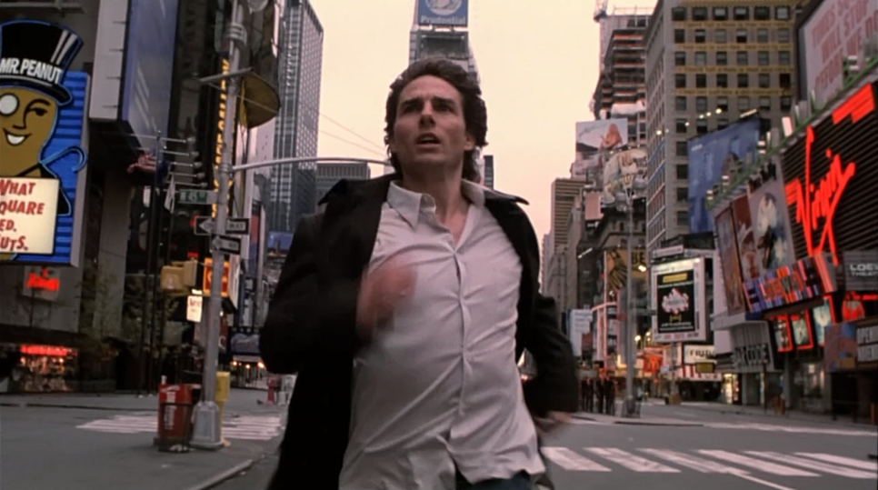 바닐라스카이의 오프닝 시퀀스에서 톰 크루즈는 평소와 다름없이 멋진 차를 끌고 출근길에 오른다. 그런데 가는 곳마다 사람이 보이지 않는다. 이상한 낌새를 느낀 톰 크루즈는 급기야 타임스퀘어에 이르러 현실일 리가 없는 지금 이 상황을 보면서 꿈에서 깨어나려는 듯 절규를 한다.