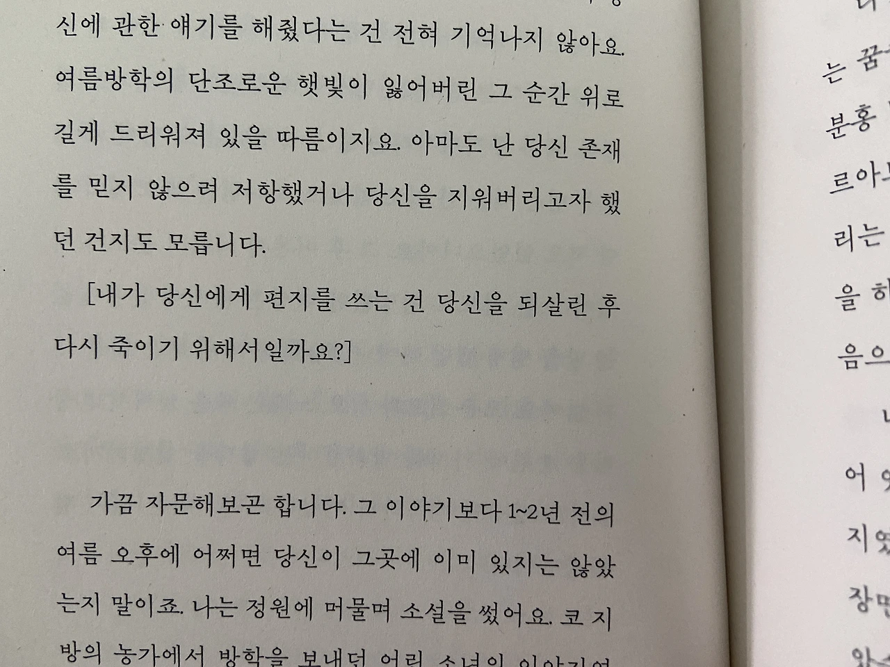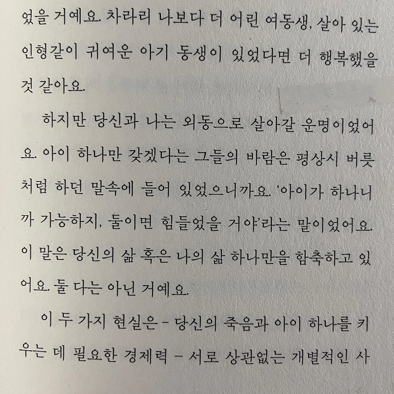 60년이 지났지만 나는 여전히 '착하다'는 단어에 걸려 넘어지고, 당신, 그리고 부모님과 연결하여 그 의미를 풀어보려 애씁니다. 이 단어의 의미가 번쩍이자마자 나의 위치가 일순간에 바뀌었으니까요. 부모님과 나 사이에 이제는 당신이 있어요. 보이지 않지만 사랑스러운 당신이. 나는 당신에게 자리를 만들어주기 위해 멀찌감치 밀려났습니다. 당신이 영원한 빛에 둘러싸여 하늘 위를 날아다니는 동안 난 그늘로 떠밀려갔지요. 무남독녀라 누구와도 비교당하지 않고 살던 내가 비교의 대상이 된 거에요. 현실은 서로 배척하는 단어들이 만들어냅니다. 더/덜, 또는/그리고, 전/후, 존재하거나 존재하지 않거나, 삶이나 죽음 같은 단어들에 의해.