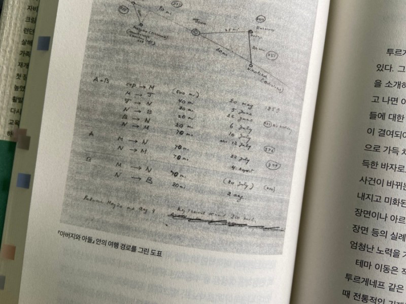 전공 교수님께서 독문학 강의를 해주실 때마다 본인이 작중 화자에 이입 해야함을 강조하셨다. 허나 보통 19세기 말 ~ 20세기 초반 문학에 대한 강의 내용이거나 중세 독일문학을 다루었기 때문에 완전하게 화자가 되는 일은 쉽지 않았다. <나보코프의 러시아 문학강의>를 읽고, 나보코프 작가를 교수님으로 만났다면 문학에 심취할 수 있지 않았을까 하는 생각이 스쳤다. 작중 수록된 나보코프가 직접 작성한 글과 그림은 강의의 실감도를 높여주었는데 강의록에는 설명 뿐만 아니라 당대 유행했던 패션스타일, 위에 첨부한 것처럼 <아버지와 아들>의 여행 경로 도표, 사교 파티에서 춤의 동선 등을 상세히 설명해두었기 때문이다. <안나 카레리나>를 읽다가도 찾아보지 않았던 Marzuka 댄스를 <나보코프의 러시아 문학강의>를 읽으며 틀어두었으니, 두말할 필요도 없겠다.